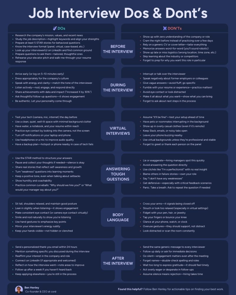 Ben Henley shared an interview cheat sheet that every job seeker should read. It covers six stages of the process:
