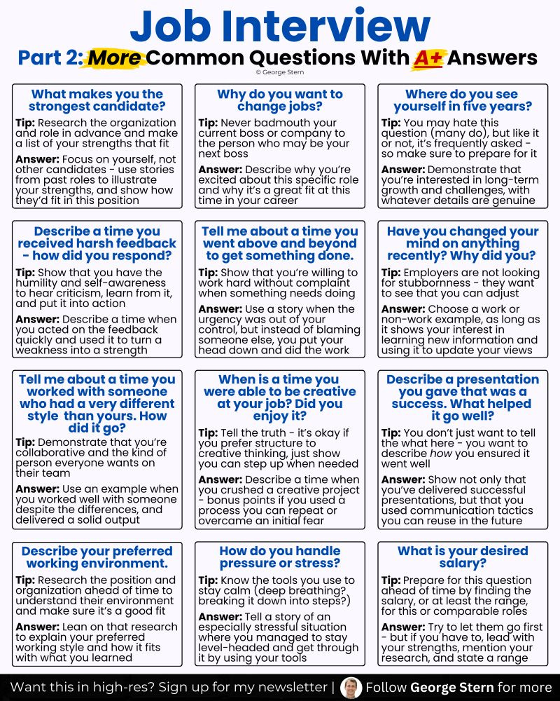 Preparation is the secret to nailing any interview. George Stern outlines the 12 questions you must prepare for and how to craft strong answers.